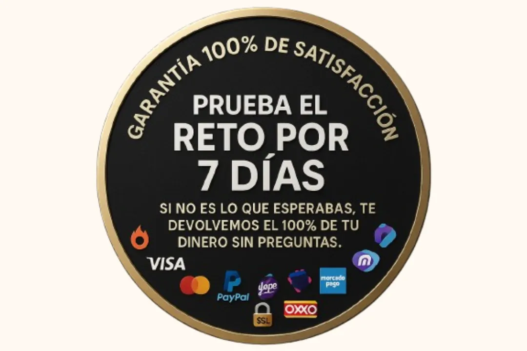 Si por alguna razón no estás satisfecho con el RETO, contáctanos dentro de los 7 dias posteriores a la compra y te proporcionaremos un reembolso completo sin hacer preguntas.